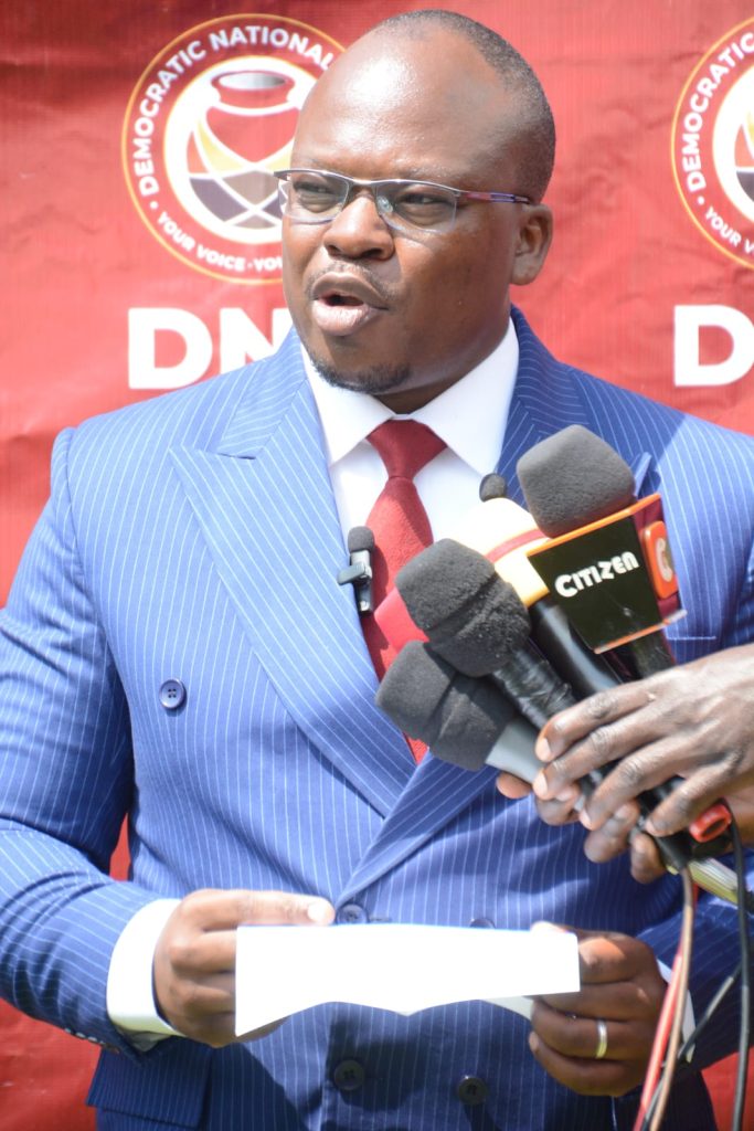 DNA Secretary General Dr. Barrack Muluka speaking during the partnership with the KIKAO Youth Movement at their Party Headquarters on August 5, 2025.
